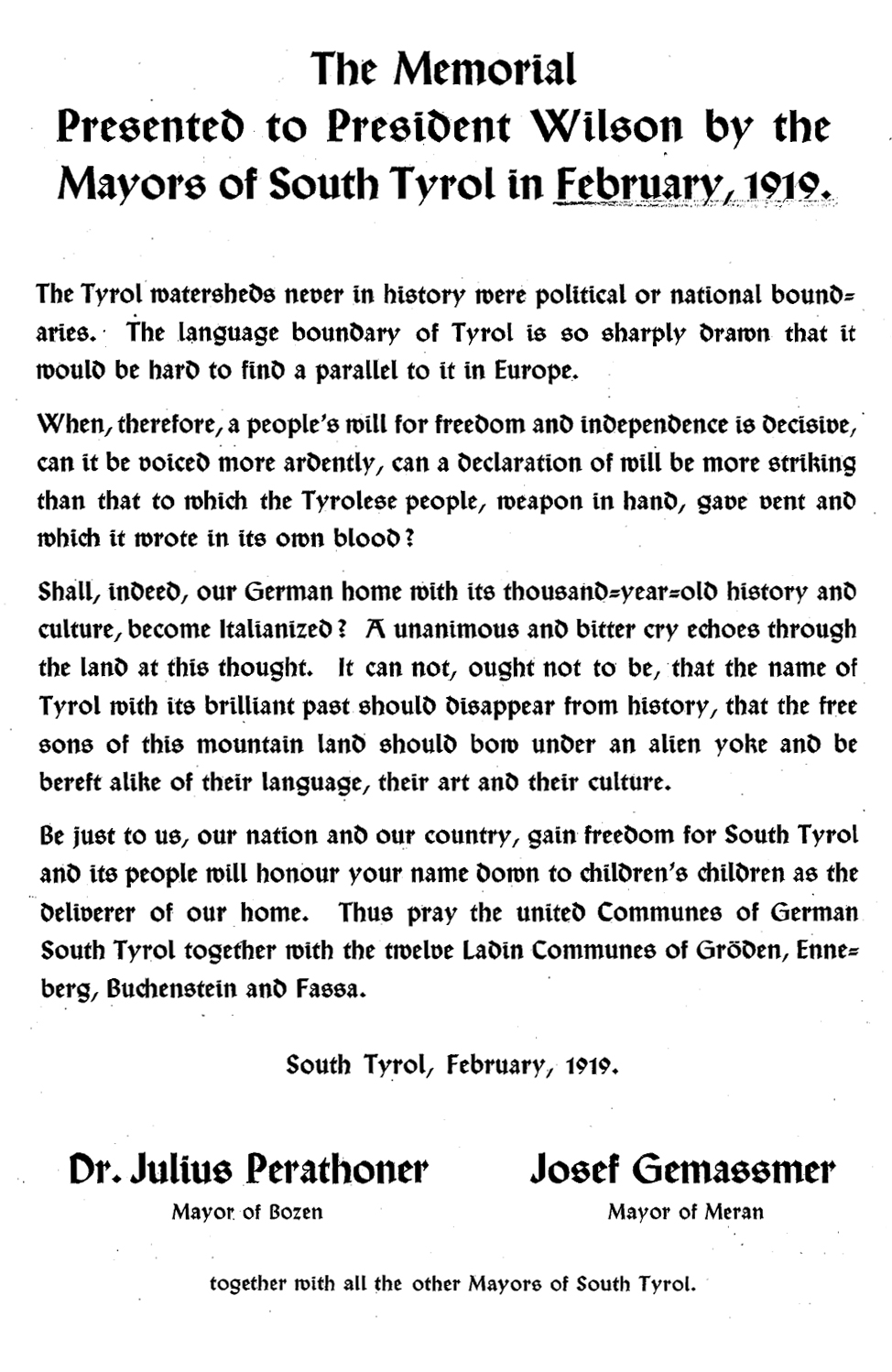 A summary of the most important memorandum sent by South Tyrolean leaders to President Wilson in February 1919, Landesarchiv Tirol, Referat S, 24/16 Kampf um Südtirol B/1
